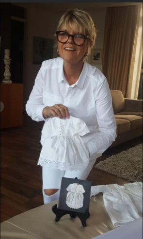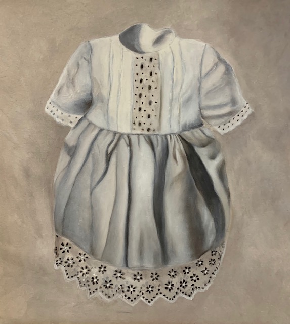Ik bezoek graag brocantemarkten op zoek naar mooie lijsten en om geschikte onderwerpen te vinden, een voorbeeld is het poppenjurkje hiernaast.